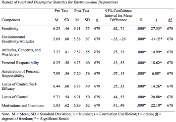 The results from the paired samples t-test show that environmentally-themed higher education courses are having a significant positive impact on students’ self-perceptions of their environmental literacy. The overall positive change in environmental literacy, taken from an average of all items from each section, achieved a significance level of t (678) = 39.53, p < .001. Across each aspect, there was a significant positive change in environmental literacy scores between pre- and post-test. The results of the t-test and descriptive statistics for each of the environmental literacy aspects (knowledge, dispositions, competencies, and behavior) are presented in Table 1.