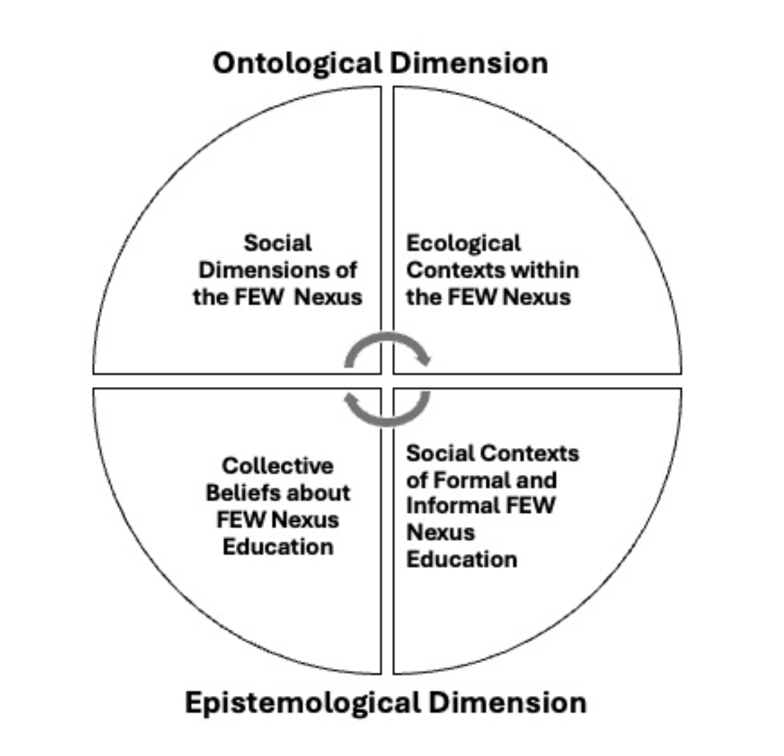 This foundation includes two ontological dimensions (educators’ assumptions about the nature of social and ecological systems) and two epistemological dimensions (their assumptions about how knowledge and learning occur within educational structures and collective beliefs about teaching, learning, and equity). This foundation supports more intentional design and more coherent research on FEW-Nexus education, contributing to the broader purpose of determining how the FEW-Nexus can advance education, moving local, regional, and global SES toward sustainability and security.